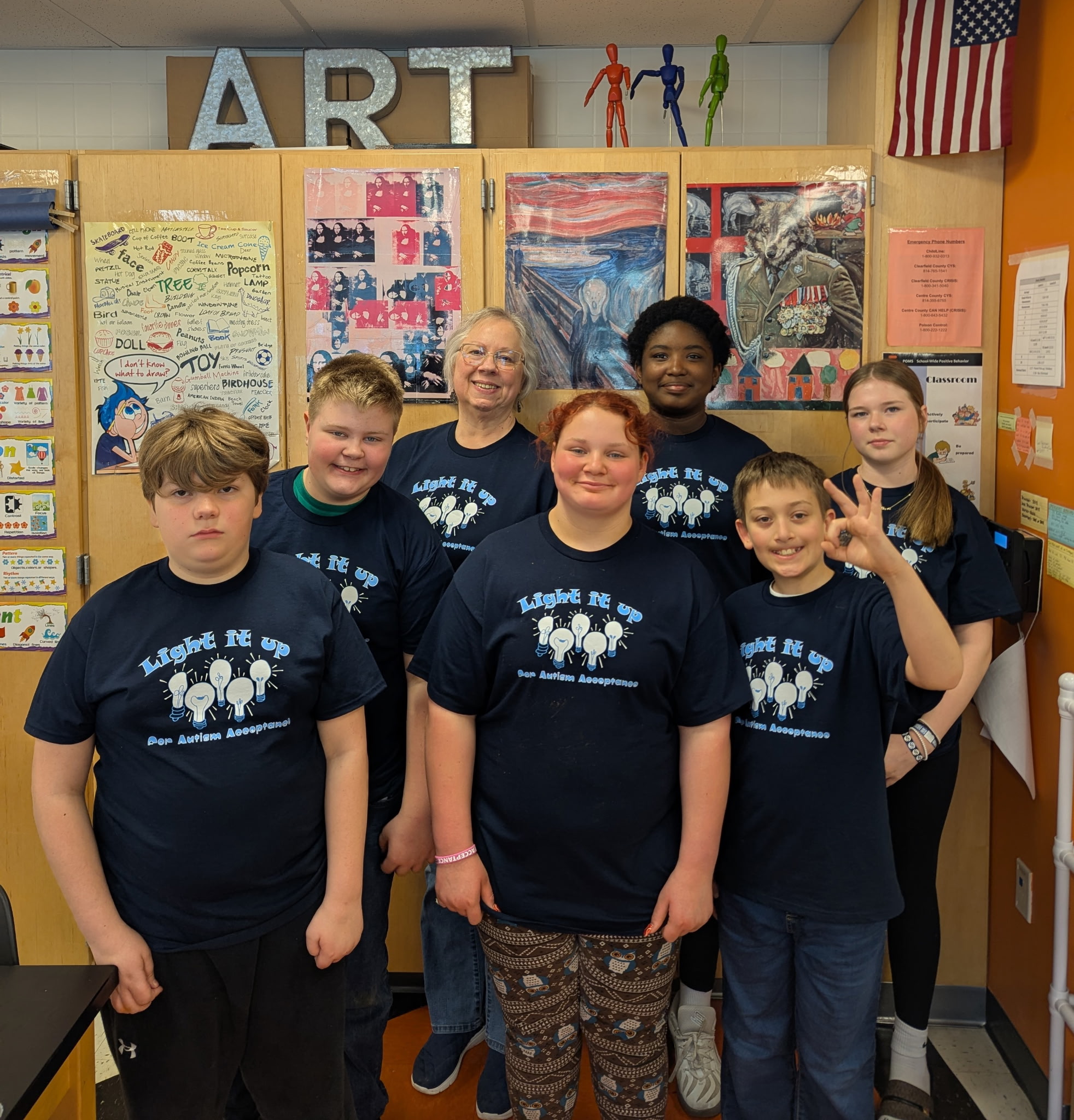 Today, Mrs. Potter's Unified Art students wore the t-shirts they helped design for Autism Acceptance Week. Each student drew their own lightbulb to be added to the shirt. Absent from the photo are ...